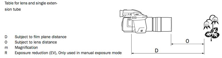 With reference to manufacturers (Hasselblad) data sheet you can see that subject to 'film' plane, lens to subject, magnification and exposure compensation data is given for each lens tube combination.