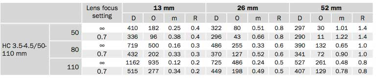 In this case I will only use the section of the table dealing with the HC 3.5-4.5/50-110mm Lens