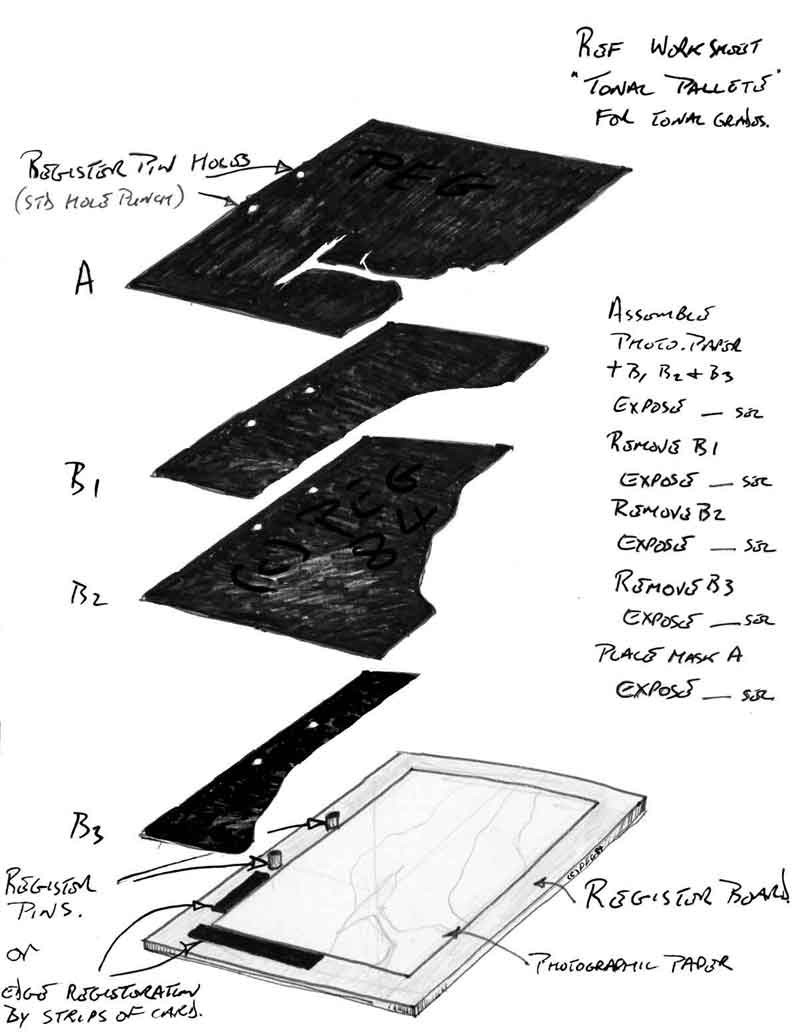Sketch the scene then photocopy onto card say 100g red, cut away waste ( but retain ) then assemble using lines on largest as a guide and punch the full set whilst assembled.The next step is to produce a tonal pallete (test strip) for the paper you intend to use by exposing same to light for set intervals of time and developing giving a gradation from solid black to base white